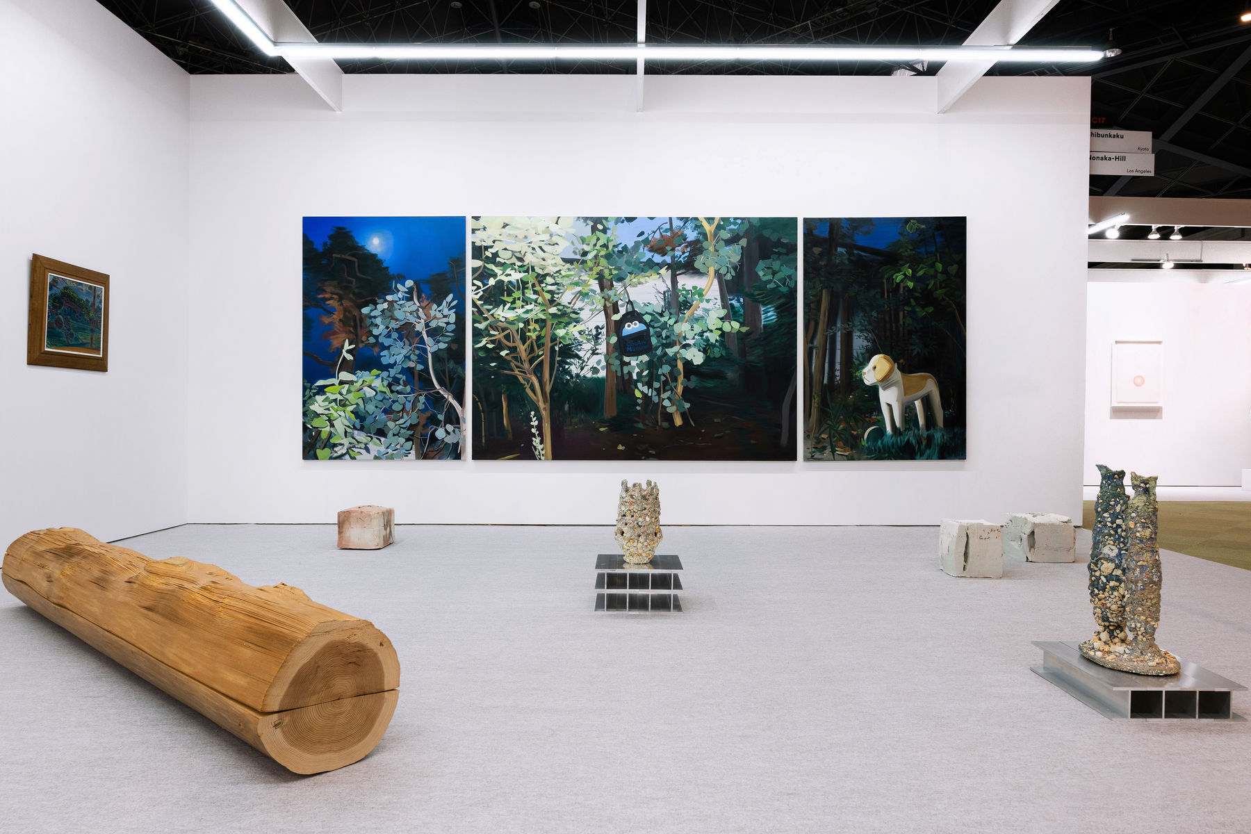 For ACK, Shibunkaku and Nonaka-Hill are pleased to present a selection of works which transcend time and space to find an audacious and almost theatrical harmony. Mural scaled depictions of serene nature, produced three centuries apart by Rimpa master Ogata Kōrin and by contemporary artist Ulala Imai, set the stage for the lush, nature examinations by New York based painter Ellen Altfest, by modern Nihon-ga master Matazō Kayama and by Zenzaburo Kojima, a legendary Yō-ga artist. A theme of pure material physicality unites the arrangement of Kazuo Kadonaga’s massive sliced and reassembled log with Eiji Uematsu’s sculptural forms evolved from clay cubes and Masaomi Yasunaga’s vessels formed of glaze which appear to have been excavated from centuries ago. Altogether, the works created by artists from different periods and backgrounds will evoke a quiet twilight-to-nocturnal aura that brings a rich and deep breath.